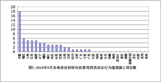 從查處的轉(zhuǎn)包、掛靠等四類違法行為看,安徽、湖北省查處項(xiàng)目相對較多(見圖2)。